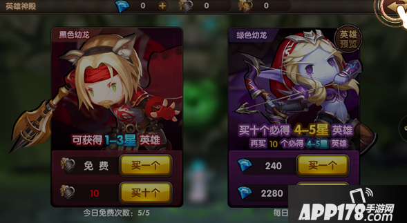 1、使用召唤功能,花费钻石获取4-5星英雄。每购买十个绿色游龙能够必得一个4-5星英雄,这是游戏中快速获取高星英雄的最好方式。而且一次购买10个还能有95折的优惠