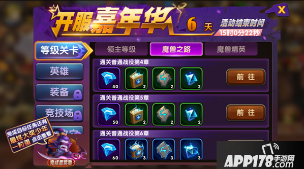 如开服嘉年华的“魔兽之路”,通关各个战役可以获取一定数量的钻石和其他奖励,日常任务和主线任务中都有钻石奖励等待大家去领取。