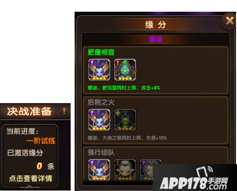 相应的在决战黑庙的左上角界面会有当前试炼阶数和上阵英雄已经激活的缘分数量提示,点开此面板我们可以各个英雄已经激活的缘分,我们可以以此为依据选择我们需求的英雄。