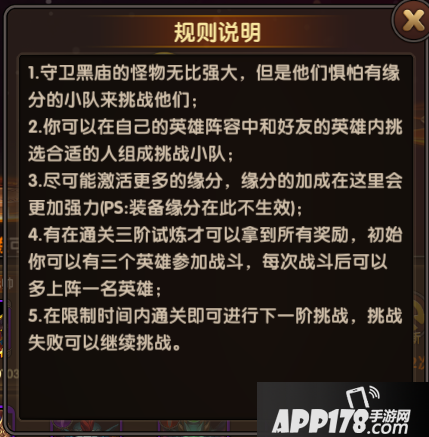 关键点一:首先我们来看一下决战黑庙的规则说明:其中的关键处就在于缘分,缘分的属性在这里是有加成的,这样我们就清楚了,尽量去凑齐上阵英雄的缘分。