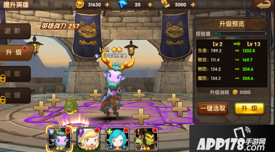 英雄升级系统,在提升英雄的界面中,点击英雄周围的加号或者右侧的【一键选取】可选择小龙宝宝吞噬升级。右侧还能看到升级的属性对比。