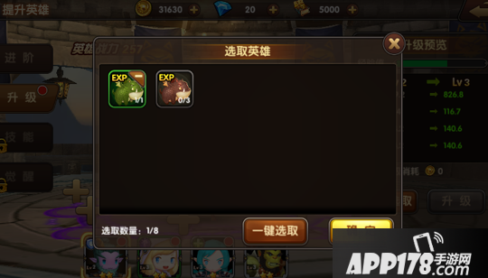 界面下方点击可选择英雄升级,每次最多可吞噬8个小龙宝宝。小龙宝宝分3个品质,从颜色上可看出白色、绿色、蓝色小龙,品质越高获得的经验越多。