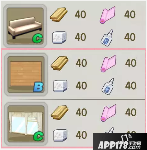 继续将材料投入再扩大些吧,调整为:40.40.40.40,便出现包括大沙发、窗户、墙纸等,虽然沙发是C,但是将房间装潢得更好看,还能增加更多的积分。