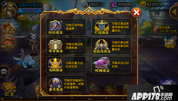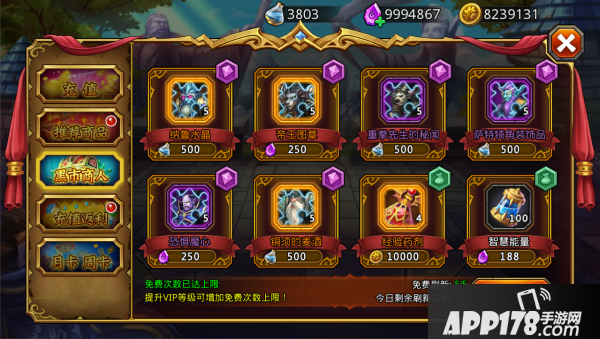 8) 黑市:花费粉尘购买英雄碎片,花费氪钻或金币购买智慧能量,经验道具。