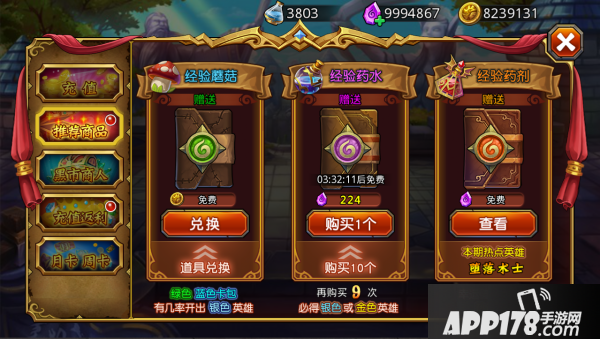 4) 兑换劵:消耗兑换劵获得大量低级级经验药水和随机奖励(随机奖励包括粉尘、金币、英雄等)