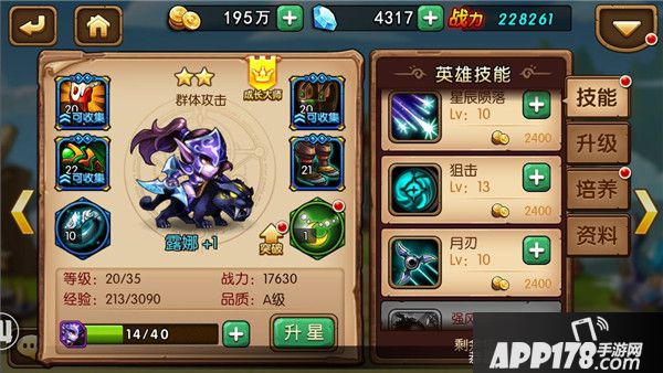 这里需要重点讲的是狙击这个技能,它能被动的提升攻击速度,也就意味着露娜将比别的英雄更快地进行输出,同样地,她的大招也CD得更快。所以优先升级月刃也是更好的发挥露娜战斗力的选择。在露娜突破到紫色之后,可以再次学会一个群体技能——强风一击,这个技能除了不俗的伤害之外还附带击退效果,相对来讲作用微乎其微,因为击退本身对于战斗帮助并不大,还很有可能打乱对方的阵型,让己方很多技能落空。