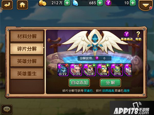 除材料素材外,我们平时的普通扭蛋、钻石扭蛋也会产生大量的英雄碎片。我们当然也可以通过多余的C级、B级英雄碎片分解成英雄粉尘,毕竟碎片变成粉尘买更好的英雄总比放在那里吹冷风要好得多。