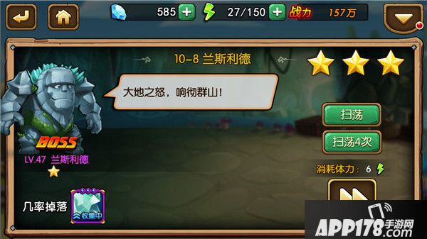 处理方法:兰斯利德看起来伤害高血量厚,实际近战公司速度并不算快,而且普攻伤害一般。直接使用近战输出类英雄,当做坦克使用即可。这个近战输出英雄一定要把胸甲和护腕的装备等级强化至70以上,否则依然有秒杀危险。