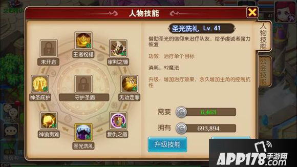 技能分析:圣骑士必备的奶技能,但是跟牧师相比不仅血量少,而且只能单体,如果敌人的单体输出高,圣骑士可以考虑用这个技能补位,否则,还是把治疗的责任交给牧师吧。