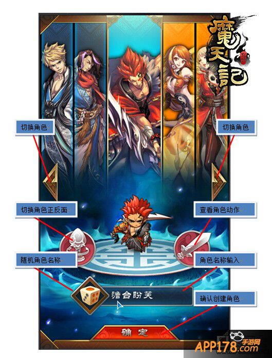 玩家进入游戏,选择自己游戏中的角色造型。游戏提供了4男,4女共8个角色,切换可以选择自己想要的角色,同时,可以查看每个角色正反面,以及角色动作。玩家扮演的是一个从现世穿越到魔天世界的青年。界面随机给出角色名称,玩家可以自己填写角色名,,确定创建角色,就可以开始游戏了。