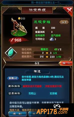 法宝可以通过强化来提升威力,品阶越高属性越好,可以强化的次数越多,玩家消耗指定材料来进行强化。