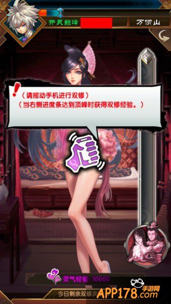 在达到一定的修炼境界之后,完成任务即可开启炉鼎双修,玩家通过摇一摇累积双修经验,亲密度修炼到达一定阶段之后更有惊喜等着你哦!