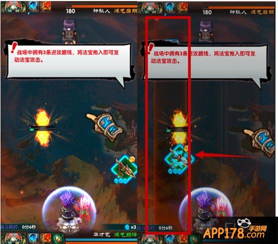 进入战斗之后,点击选取右侧已点亮的法宝并拖拽移动到任意一条进攻线路中,此时战斗处于暂停状态,对应的进攻线路会显示高亮,手指离开屏幕即可使用该法宝,之后战斗会继续自动进行。