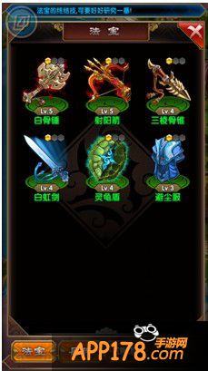 主要存储已经收集到的法宝成品,法宝按颜色排序,用户可以在该界面进行法宝的强化和炼制法宝。
