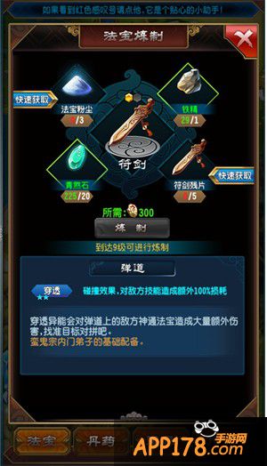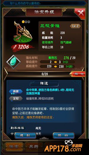 法宝可以通过强化提升法宝的威力,品阶越高属性越好,可以强化的次数越多,玩家消耗指定材料来进行强化。