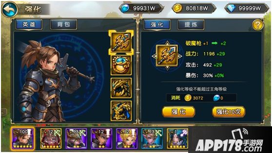 强化装备,是提升装备基础属性最直接的方法,使用金币与强化石进行强化,在强化界面可以选择强化1次与强化10次,更可以在角色属性界面选择一键强化,来增加装备的基本属性,一般情况下装备的强化等级无法超过主角的等级。