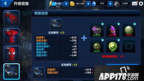 点击屏幕左侧【装备】,可以看到每个英雄有四个装备,这是本游戏的一个特色,蜘蛛侠的是喷蛛丝装置、经典服装、头套和腰带,每个装备都有独特的属性加成,在升级时加成都会有提升(难不成还削弱?)