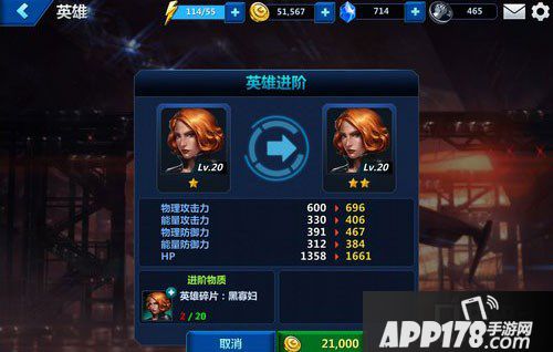 举个栗子:一个1星英雄黑寡妇想要升级为2星英雄,那么就需要该英雄的碎片20个,在英雄界面点击进阶即可(需要消耗不少的金币)。