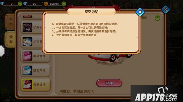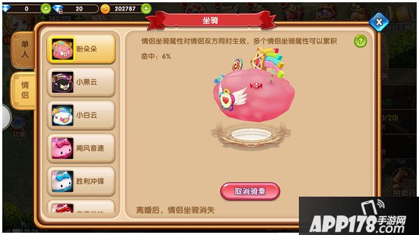 情侣坐骑只需要一方购买,购买后另一方也可以获得该坐骑。还可以双人共乘坐骑,遨游童话世界哦~怎么样,是不是已经开启期待你浪漫美好的未来啦?情侣坐骑有六种:粉朵朵、小黑云、小白云、飓风音速、胜利冲锋、音速战神。这些坐骑分别可以提高主角的不同属性如:命中率、攻击值、生命值、闪避率、韧性率、暴击率等。