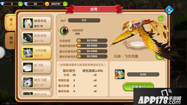 单人坐骑目前开放了6种,分别是萌萌羊驼、鲨鱼导弹、飞天凤凰、纸飞机、晴天飞猪、嗜血战虎。