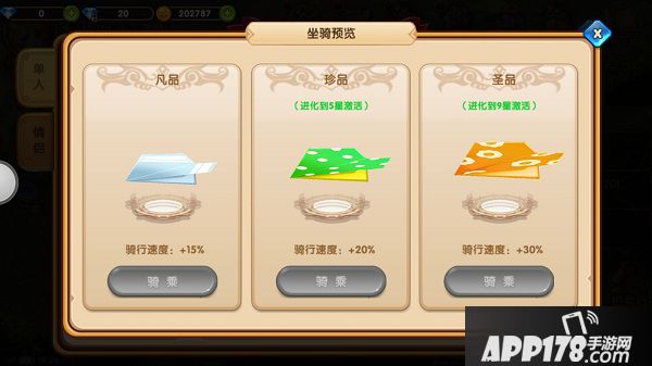 游戏中的坐骑有三种不同的品阶。分别是凡品、珍品、圣品。玩家可以通过进化来提升坐骑的品阶。在进化之前要先洗洗手哦~因为进化坐骑不一定是百分百成功的哦~