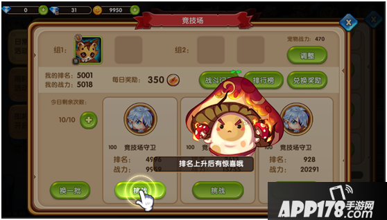 竞技场玩法简单,可以自己挑选PK对手,在挑选过程中可以选择名次靠前但战力比自己低的玩家,这样可以快速获得奖励哦~每天都可以免费挑战10次哦,每次挑战后需要冷却10分钟,让自己的角色休息一下~如果想快速进行下一次挑战,也可以消耗钻石消除冷却哦,10次免费挑战完成之后,也可以消耗钻石增加挑战次数的哈~小伙伴别忘记了哦~
