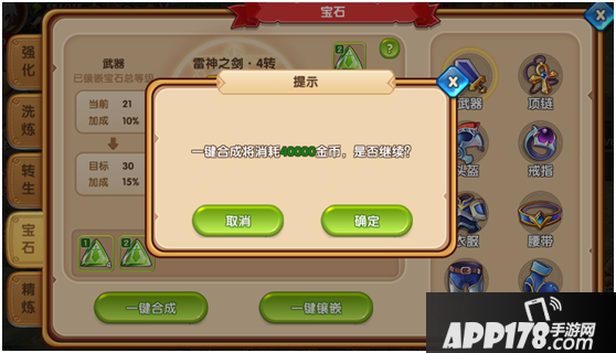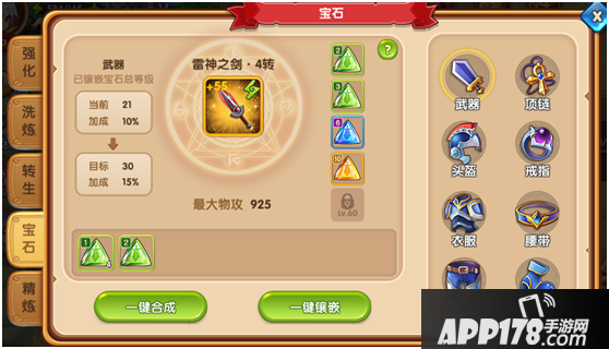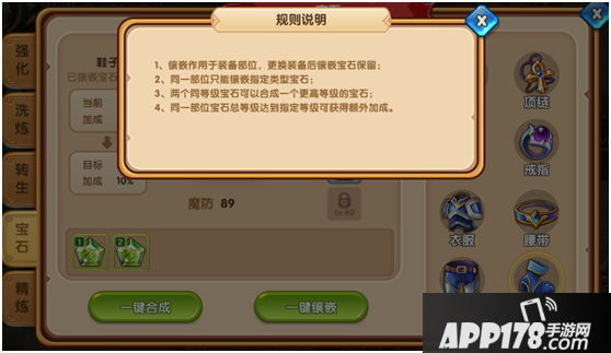 在镶嵌宝石之前别忘记了先合成一下低级的宝石噢,因为我们的宝石镶嵌槽数量有限喔,需要尽量镶嵌高级的宝石噢!
