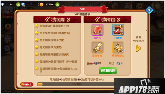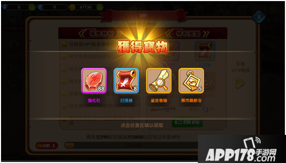 VIP1可以使用绑定钻石购买一个礼包喔,里面有好多材料,非常的超值噢!