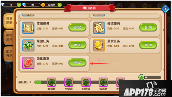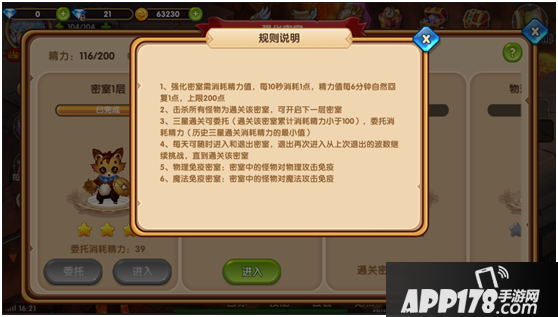 进入强化密室界面后从密室1开始挑战,每次挑战成功开放后续密室的挑战,等级越高可以挑战的副本也越多噢,获得的强化石也更多喔!