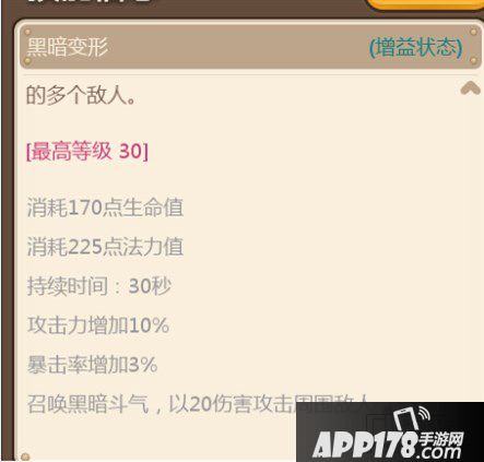 黑暗变型是恶魔的增益技能,是玩家在四转94级之后才能学习的。
