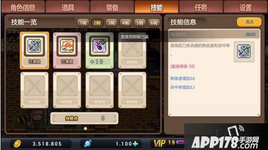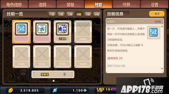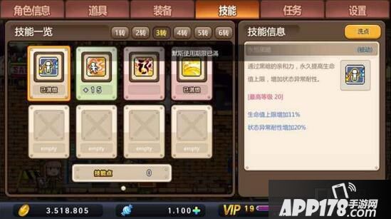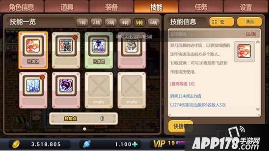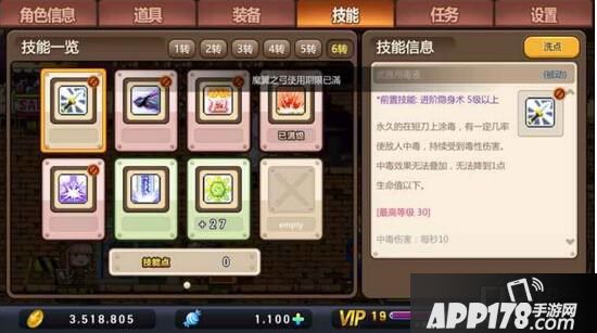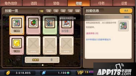 一转技能,没有学习隐身术,是因为在满级之后的防御不需要这个技能了。