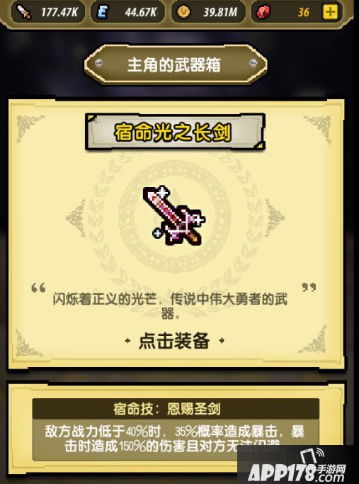 《冒险与挖矿》是开发商Y2Game推出的一款沙盒类RPG。游戏需要在主城战斗,像素风格的角色不断遭遇小怪,由玩家组起的冒险大队通过一道道关卡,击退一只只BOSS,不断寻找伙伴组成自己的冒险小队。游戏中有许多道具,其中武器有非常多种类,下面小编就为大家带来冒险与挖矿宿命光之长剑介绍。