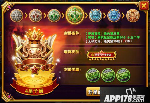 每个爵位的条件个数和内容不同,全部达成后可激活对应爵位,并且领取奖励
