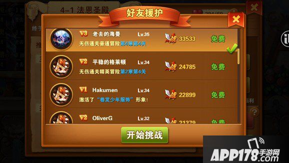 好友助战在普通冒险3-5开启,点击挑战即可打开好友助战面板。