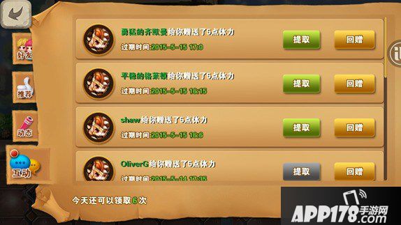 好友之间可相互赠送体力,在互动面板中,可以处理其他玩家跟你之间的互动消息。