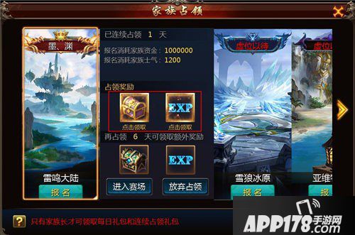 ③连续占领领地达7天、14天、21天、28天的家族,其家族成员们可领取“领地连庄经验”,即丰厚的经验奖励。
