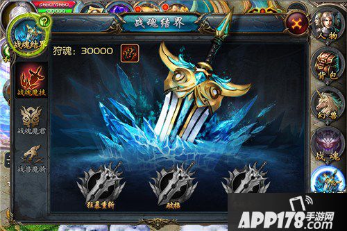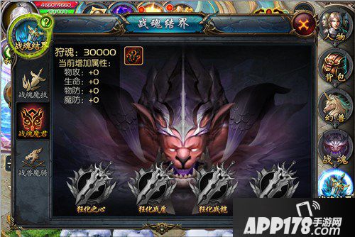 战魂魔君:狂战士通过体内的战魂取得战神之力,在战魂属性评分达到要求时,使用收集到的狩魂进行献祭,可以获得战神的恩赐,提升自身攻击、防御与血量。