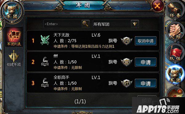 在游戏里点菜单-军团,如果你还没有军团,看到的就是军团列表界面,在这里你可以找到已经建立的军团,在你想要进的军团后面点“申请”,就可以等军团里的官员审批了!如果不小心点错,再点一下“取消申请”还可以取消掉。