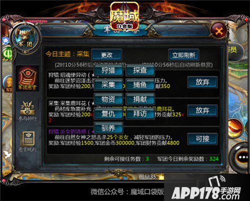 玩家每天都可领取最多5项军团任务,其主题包括狩猎、采集、物资、复仇、驯养、探查、捕鱼、捐献和拜访。任务的品质星级将影响奖励产出,玩家通过击杀怪物或其他玩家,收集军团所需物资,捐献财务等方式,可增加军团的建设度与军团资金。