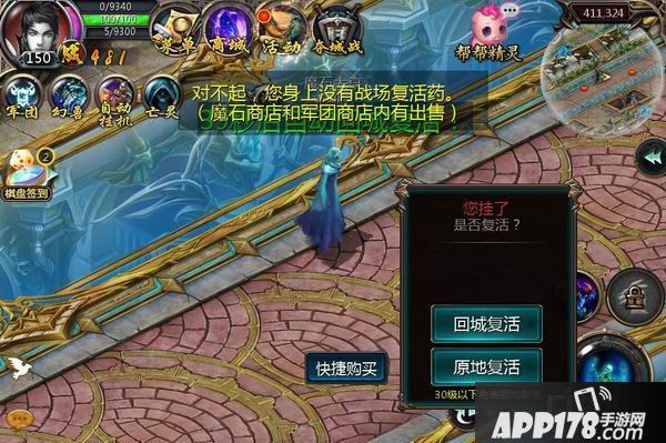 在军团地图内死亡,画面上将出现使用战场复活药的“快捷购买”提示。