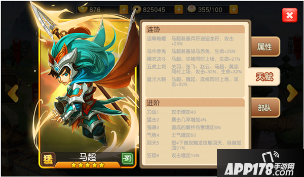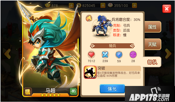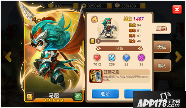 马超带领的是克制弓兵的骑兵,由于其自身是一位高攻的武将,配合其高加成的技能,使其在战场中能造成足量的伤害,其自身的进阶技能,使其能更好的存活。