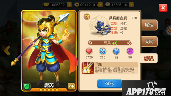 庸芮所配备的为弓兵,主要克制敌方步兵,移动速度快,随弓兵的强化等级提高兵种属性加成并且进行3次普攻后可使飞射技能对敌方步兵造成400%伤害。
