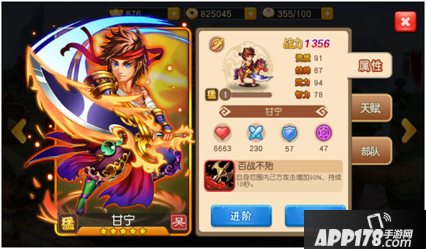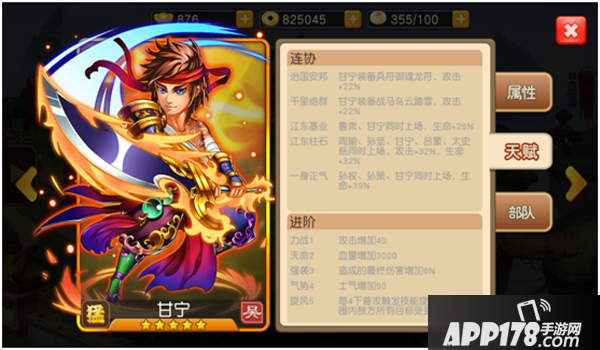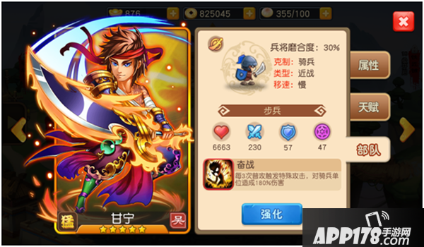 甘宁带领的是克制骑兵的步兵,配合其自身和进阶的技能,能快速清缴敌方意图突进己方后排的骑兵,保护己方输出武将。