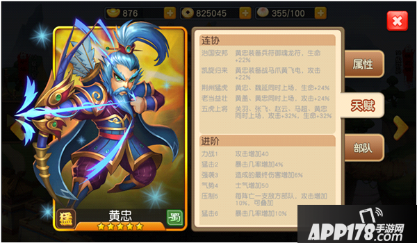 关羽、张飞、赵云、马超、黄忠5人并称为五虎上将,5人同时上场时,可提高5人32%攻击和32%生命,自身进阶技压制,在每消灭一直敌方部队后,攻击即可增加10%