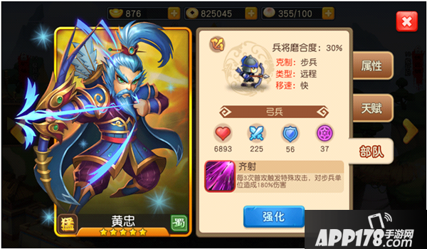 黄忠带领的是克制步兵的弓兵,配合其强大的自身技能,进阶技和五虎上将的连协,使其在后期拥有超高的爆发伤害。