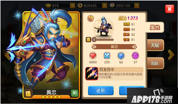 本作中,黄忠的初始战斗力为1373点,资质91点,统帅90点,武力也达到了92点