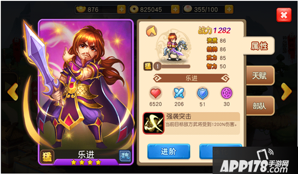 本作中,乐进是一位4星的紫色武将,初始战斗了为1282,其资质、统帅和武力值均超过了85点,是一位高攻的武将。