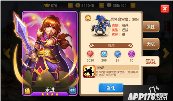 乐进所带领的是克制弓兵的骑兵,快速突进到敌方后排,当进阶技和自身技能同时触发是能造成巨量的伤害。