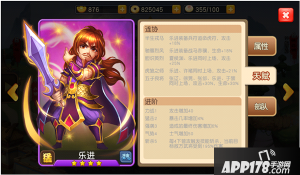 同样,身为五子良将之一的乐进,因为拥有强力的连协技五子良将,其自身不高的属性会得到巨幅的提升,进阶技斩杀,每4次普通攻击触发,对当前目标地方武将造成195%的伤害。