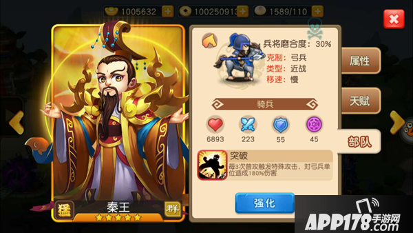 秦王所带领的兵种则是克制弓兵的骑兵,综合以上的内容来看,秦王是一个属于耐打抗揍能又有很高输出的英雄。在战场上的主要目的还是用来拖住对方主力,为己方攻击武将赢得时间 !